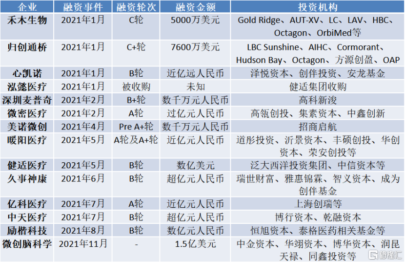 图:2021年神经介入领域投融资事件