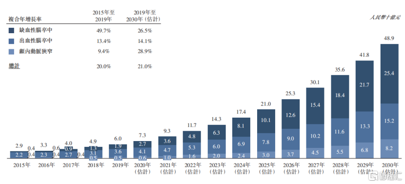 神经介入手术作为近两年以来迅速发展起来的微创治疗方法,相较于传统治疗,其拥有治疗时间窗口长、副作用小等多种优势。伴随着我国神经介入手术普及率的增加,我国神经介入医疗器械市场规模已由2015年29亿元增至2019年60亿元,复合年增长率为20%。并将进一步增长至2030年489亿元,2019年至2030年的复合年增长率为21%,已进入高速增长阶段。
