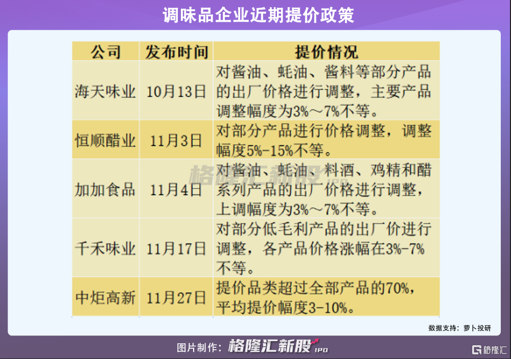 去年10月,由龙头海天味业带头提价,中炬高新、恒顺醋业、加加食品、千禾味业等相继响应。
