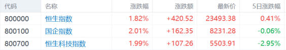 1月7日,港股主要是指数呈单边上涨行情,科技股延续反弹,引领大市上扬。恒指涨1.82%,报23493.38点,周涨0.41%;国指涨2.01%,报8231.28点,周跌0.06%;恒生科技指数涨1.99%,报5503.91点,周跌2.95%。
