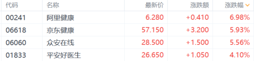 互联网医疗涨幅居前,阿里健康、京东健康、众安在线涨超5%,平安好医生涨超4%。