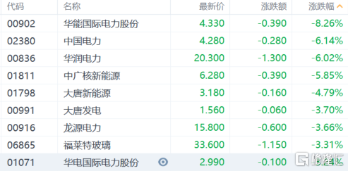 电力板块领跌,华能国际电力股份跌超8%,华润电力、中国电力跌超6%,中广核新能源跌近6%,大唐新能源跌近5%,龙源电力跌近4%。