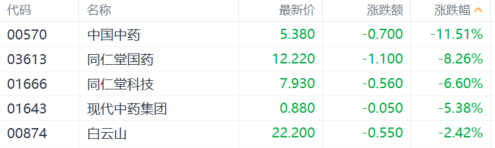 中医药股集体萎靡,中国中药跌超11%,同仁堂国药跌超8%,白云山跌超2%。