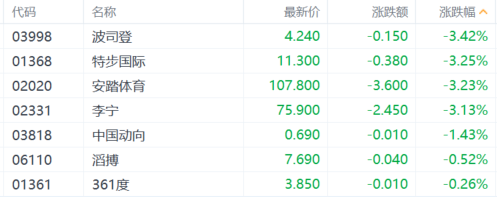 体育用品股跌幅居前,波司登、特步国际、安踏体育、李宁跌超3%,滔搏、361度跟跌。