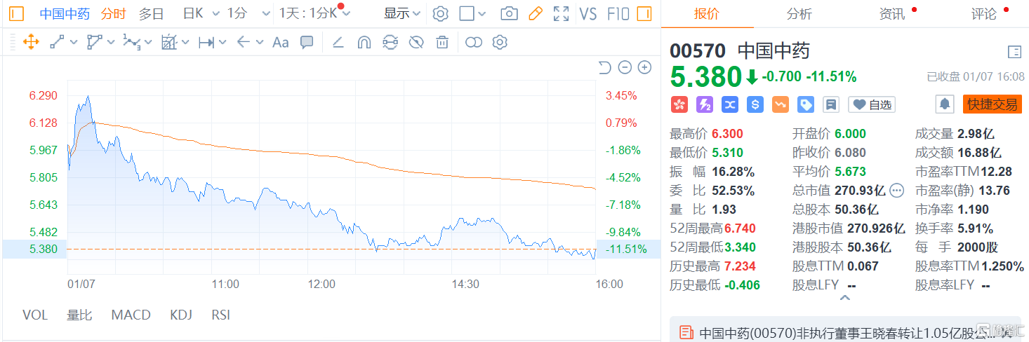 中国中药收跌11.51%,报5.38港元,总市值270.93亿港元。公司午间公告,公司董事会副主席王晓春通知,因其个人财务安排,已以每股5.57港元的价格转让其持有的公司股票1.05亿股,相当于截至公告日期已发行股份的约2.09%。转让后王晓春通过其全资拥有的恒迪投资有限公司间接持有公司约1.65亿股股份(转让前:约2.70亿股),占公司全部已发行股份约3.28%(转让前:约5.36%)。