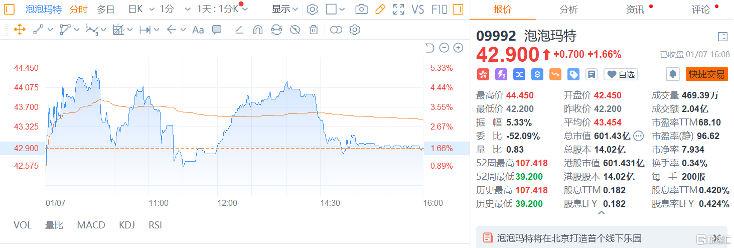 泡泡玛特收涨1.66%,报42.90港元,总市值601.43亿港元。 1月5日消息,泡泡玛特与北京朝阳公园达成合作,合作双方为北京泡泡玛特乐园管理有限公司、北京朝阳公园开发经营有限责任公司。朝阳公园将授权泡泡玛特使用园区内“欧陆风韵”项目及其周边街道、森林。据项目负责人介绍,目前项目可研和概念设计已经完成,正处于方案设计阶段,致力于将项目打造成集潮玩IP、文化传播、沉浸式体验、休闲娱乐于一体的潮流文化乐园。