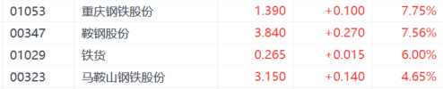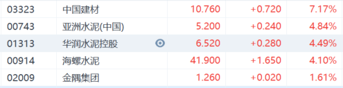 基建板块延续涨势,其中重型基建板块中中国铁建、中国中铁涨5%,中国中冶涨约4%;建材水泥股中,中国建材涨超7%,华润水泥控股、亚洲水泥(中国)、海螺水泥涨超%;钢铁股中,重庆钢铁股份、鞍钢股份涨超7%,马鞍山钢铁股份涨超3%