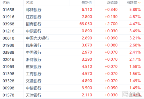 内银股表现强势,邮储银行涨近6%,招商银行涨超4%,中国光大银行、民生银行、中国银行涨超3%,浙商银行、工商银行等纷纷跟涨。