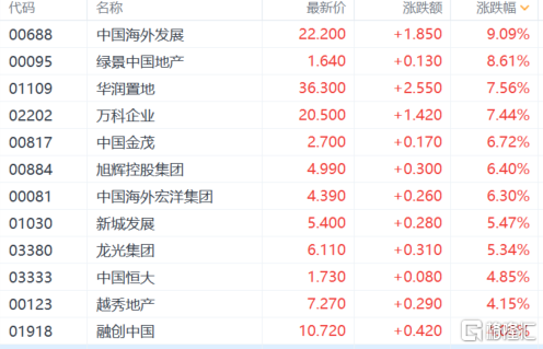 内房股普遍走强,中国海外发展涨超9%,绿景中国地产涨超8%,万科企业、华润置地涨超7%,旭辉控股集团、新城发展涨超6%,龙光发展、中国恒大、融创中国等涨超4%。