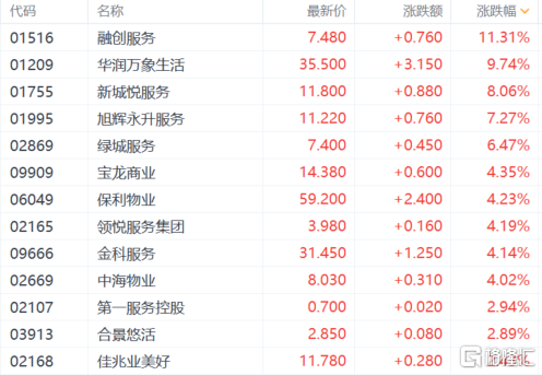 物管股跟随走强,融创服务涨超11%,华润万象生活涨近10%,旭辉永升服务、新城悦服务涨超7%,绿城服务、保利物业涨超4%,中海物业、金科服务、佳兆业美好等纷纷跟涨。