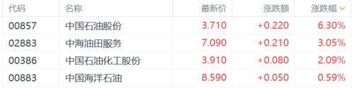 石油股普涨,中国石油股份涨超6%,中国石油化工股份涨超3%,中海油田服务涨超2%,中国海洋石油跟涨。