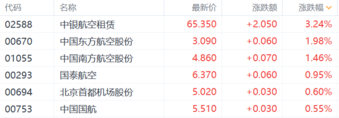 航空股集体上涨,中国东方航空涨近2%,中国南方航空、中国国航、北京首都机场、国泰航空等跟涨。