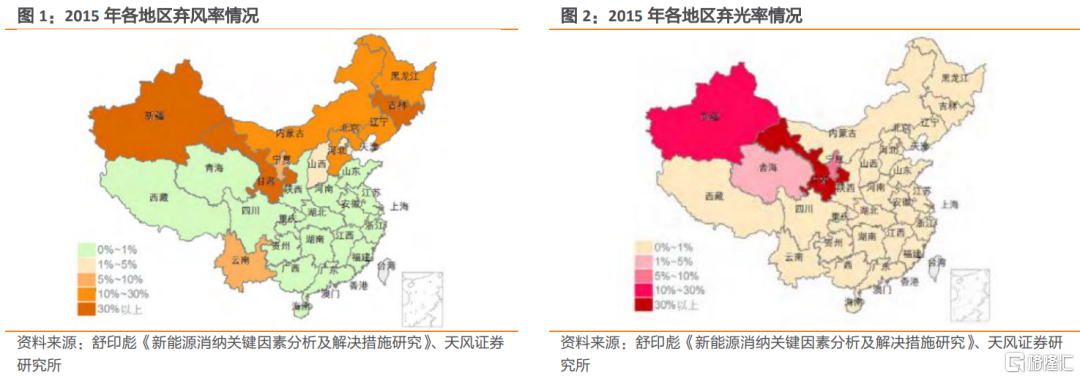 新能源装机容量快速增长,叠加消纳能力不足,我国弃风、弃光率曾一度较高。据中国电科院相关专家介绍,新能源消纳能力是指,在新能源资源及并网容量、常规电源装机、负荷水平条件下,受电力系统安全稳定运行约束下,能发多少电量的问题。过去,我国新能源装机容量快速增长,而受系统调峰能力不足、网架限电、供电负荷增长缓慢、外送计划电量偏低等多重因素影响,新能源电力消纳受限,导致我国部分地区,特别是新能源资源富余,但用电负荷增长较慢的“三北”地区,弃风、弃光率居高不下,新能源利用率也较低。例如2015年,甘肃、吉林、新疆总的弃风、弃光率分别高达36.8/30.8/30.7%。