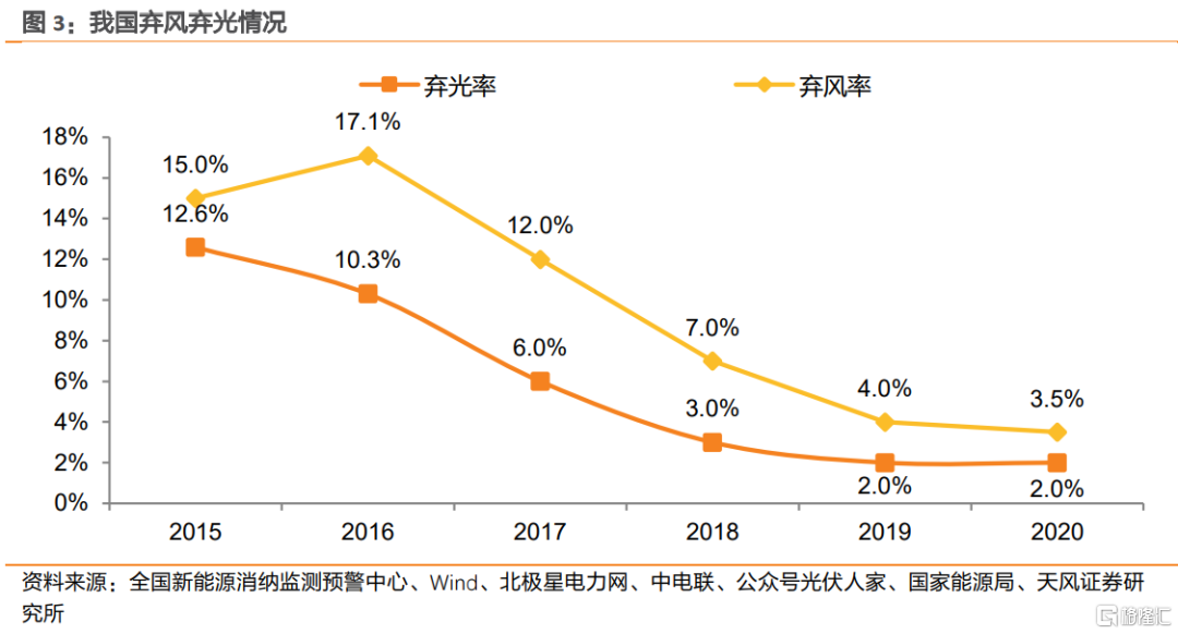 受益于政策推动,及特高压、新能源交易市场等建设,我国新能源消纳能力有所提升,但仍是未来需要重点解决的问题。为解决新能源消纳问题,政府出台了一系列保障可再生能源电力消纳的政策措施,国家电网等机构也通过多种举措全力消纳新能源,同时特高压等新能源并网和送出工程建设力度持续加强,新能源市场交易也在不断扩大,我国新能源消纳矛盾逐渐得到缓解。2020年,我国弃风/弃光率已分别下降至3.5%/2.0%。国家能源局法制和体制改革司司长朱明表示,“十三五”新能源发展面临的最大的问题就是消纳的问题,“十四五”面临消纳和接入两个问题并存,表明解决新能源消纳问题仍是十四五期间的工作重点。