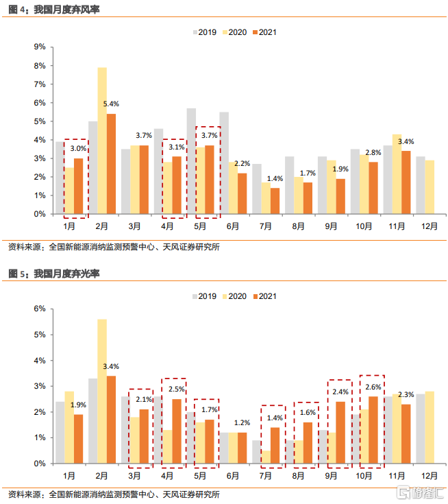 从2021年情况来看,我国弃风弃光率存在一定反弹的风险。纵向来看,部分月份已经出现了弃风弃光率同比增长的现象。2021年1-11月中有三个月弃风率同比提高;有七个月弃光率同比提高。