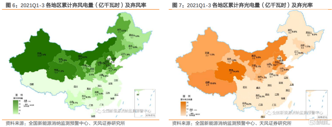 从省间来看,可再生能源消纳呈现地域不均的特点,弃风弃光现象主要集中在新疆、青海、甘肃、内蒙古等重点省份。部分省份弃光弃光率处在高位,青海2021年1-11月弃光率和弃风率分别达14.5%、11.1%,蒙西分别达到了3.0%和8.4%。