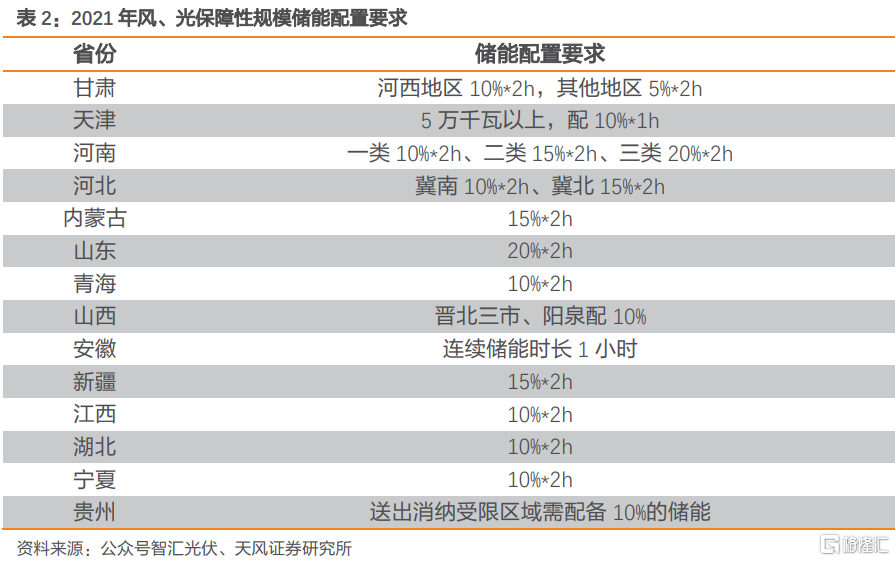 从各省2021年保障性规模竞争性配置方案来看,较多省份都提出了配置储能的要求。横向来看,各省基本要求光伏电站配置5%~20%功率、1~2h的电化学储能。纵向来看,配置要求也在不断提高。以山东为例,2020年山东储能配置要求是10%*2h,而2021年则提高到20%*2h。