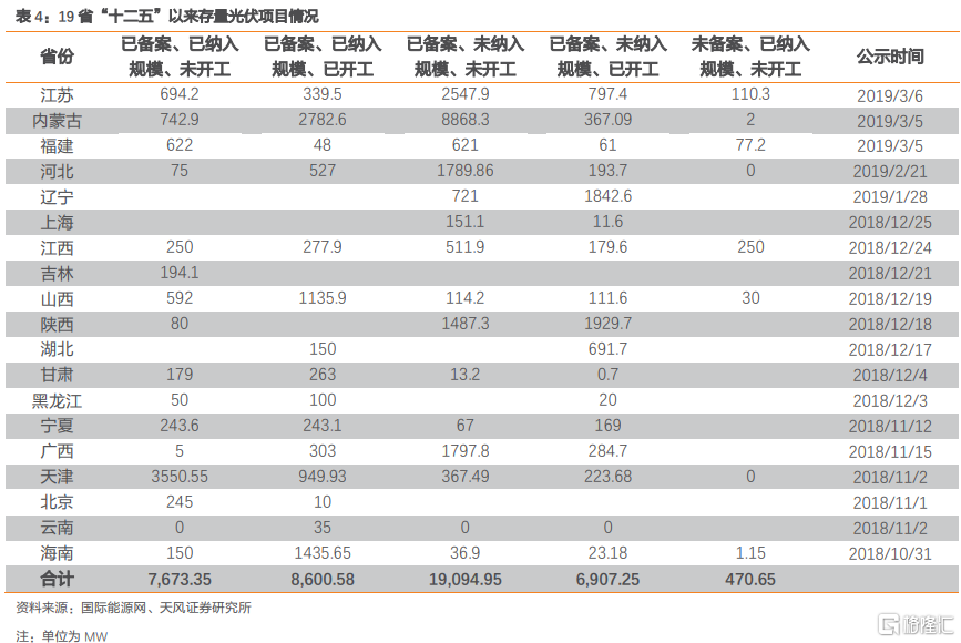 十二五、十三五期间,在政策利好的驱动下,光伏行业快速发展,在光伏电站开发建设实际中存在不少已备案但尚未取得建设指标或已备案但迟迟未开工建设的项目。2018年四季度起,大部分省份响应国家能源局的号召,陆续公示了“十二五”以来风电和光伏发电项目信息。据据国际能源网2019年3月的统计,江苏、内蒙古、河北等19省市发布了“十二五”光伏项目信息,未开工的光伏项目为27.2GW,无指标的项目为26GW。