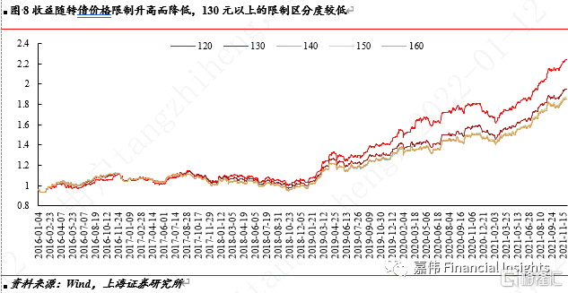 2.转债价格阈值。通过设置转债价格阈值,保留上一个月最后一个交易日的转债价格低于指定阈值的转债,起到对转债价格的限制作用。