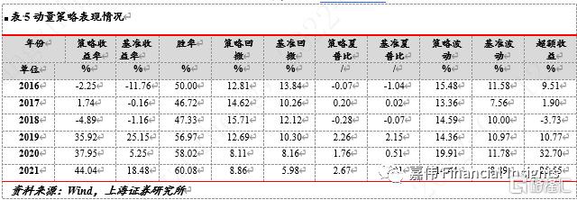 动量策略在回测期间内(2016年1月4日至2021年12月31日)取得155.44%的累计收益率,年化收益率16.92%,最大回撤20.72%,夏普比1.11。在过去六年内有五年跑赢基准,不同年度收益情况分化显著,其中2021年收益最高,较基准获得了25.55%的超额收益率,在近三年较双低策略收益能力更优。