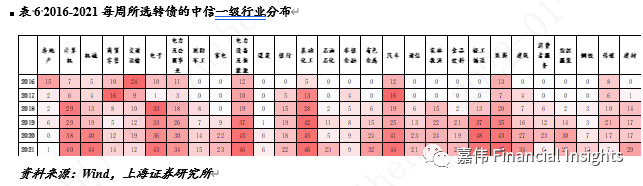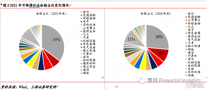 行业分布上,存续可转债余额主要集中在银行、交通运输、非银金融、电子、农林牧渔、公用事业等。相比于2020年,银行、非银、电子、农林牧渔板块余额在2021年占比有所提高。