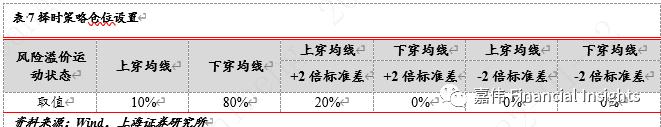 对于择时模型,主要参数涉及风险溢价模型滚动窗口长度、标准差倍数、仓位权重等。首先,我们考虑设置动态时间窗口,以30日为步长,计算30日、60日、90日、120日周期的风险溢价移动均值和标准差。在此基础上,设置风险溢价在均线上下波动k倍标准差为调仓基准参数。经过测试,选取移动窗口为60日,标准差倍数k为2。当股票风险溢价运动时,动量策略的仓位设置如下:当风险溢价上穿均线设置为10%,下穿均线设置为80%,上穿均线加2倍标准差设置为20%,下穿均线加2倍标准差设置为0%,上穿均线减2倍标准差设置为0%,下穿均线减2倍标准差设置为0%。