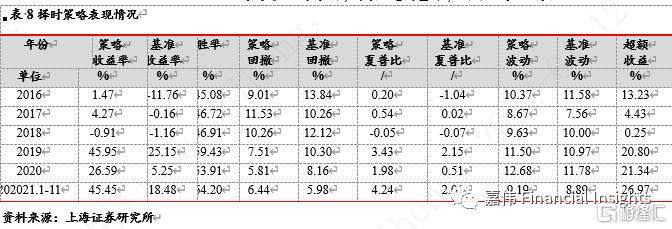 择时策略在回测期间内(2016年1月4日至2021年12月31日)取得181.75%的累计收益率,年化收益率为18.84%。高于双低策略和动量策略。2019年收益最高45.95%,回测期间内较基准获得了145.85%的超额收益率。策略的夏普比1.74,历史最大回撤13.64%,并且各年度的最大回撤都控制在此以下。