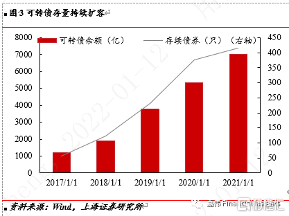 可转债发行扩容,促使存量可转债规模大幅度提升。从数量上来看,存续可转债从2017年的57只上升到2021年的415只。从金额上看,可转债余额从2017年的1198亿增长到2021年的 7008亿。