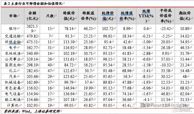 可转债市场火热,估值水涨船高。随着近几年的可转债市场持续火热,各个板块的可转债债底安全垫下降,表现为负纯债YTM、高期权价值。
