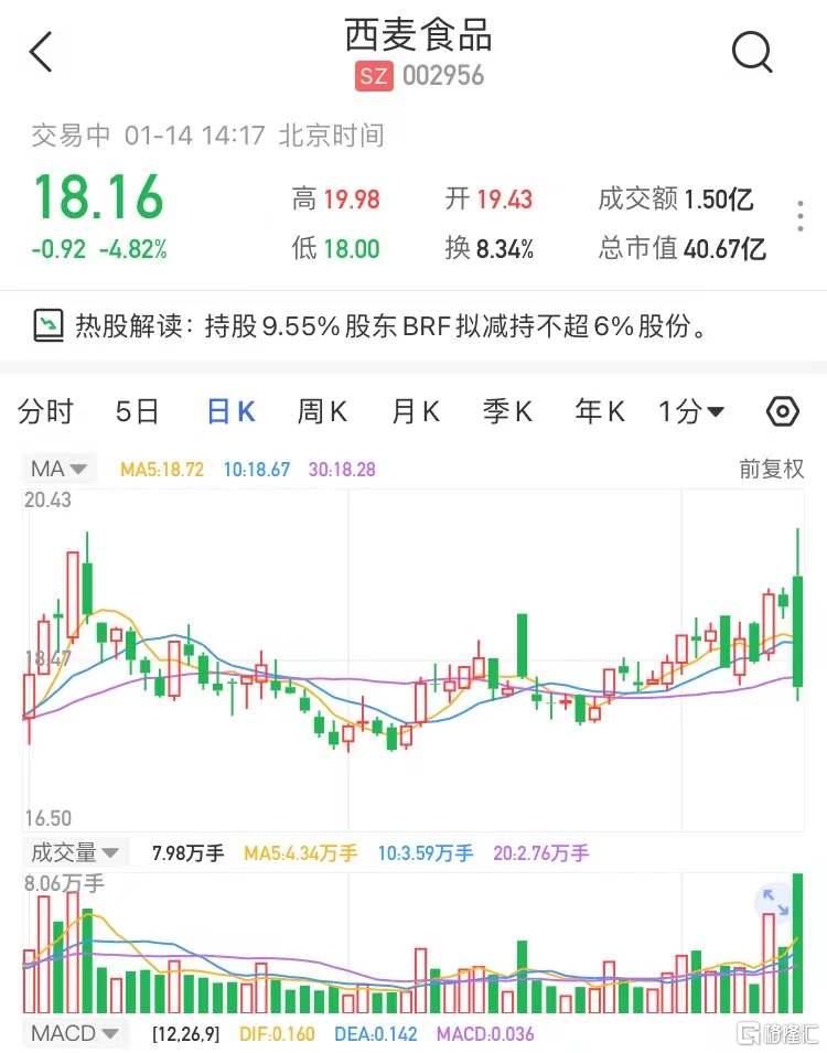 A股异动 | 西麦食品(002956.SZ)跌近5% 股东BRF拟减持不超6%股份