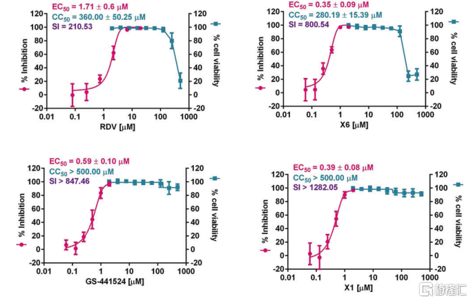 VV116的半数最大有效浓度(EC50)约是瑞德西韦的1/5,具有更好的抑制作用。VV116母体核苷(X1:氘代GS-441524)与GS-441524具有略优的EC50趋势,以及更好的安全性指数(SI)。