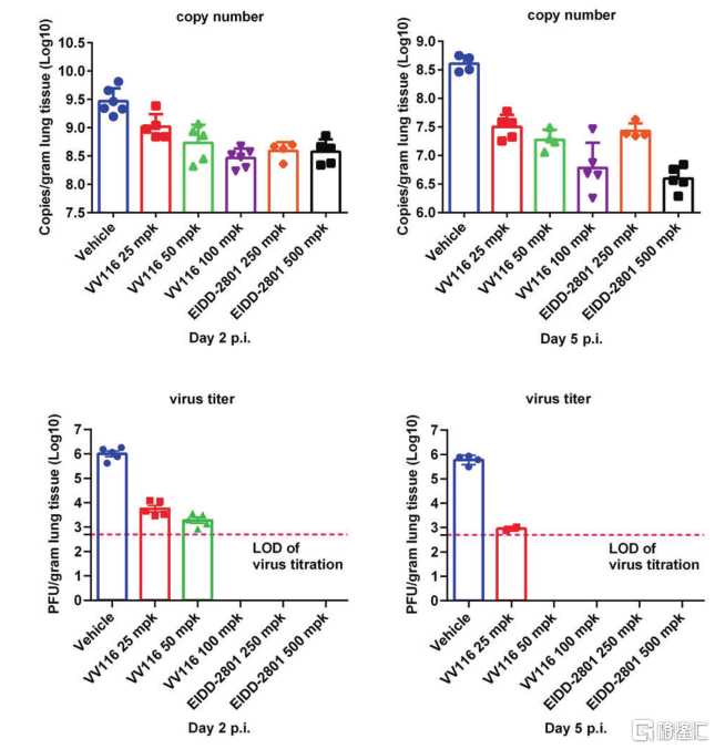 此外,PK结果显示了VV116具有高口服生物利用度,在大鼠和狗中分别达到80%和90%。在临床前感染后的动物模型中,给予VV116相较于Molnupiravir(EIDD-2801)在小鼠肺组织中的病毒RNA水平和传染性病毒滴度方面也显示优势潜力。VV116呈现剂量依赖性减少肺部病毒RNA拷贝和病毒滴度,100mpk的VV116能够将病毒滴度降低到检测限以下,达到与Molnupiravir(EIDD-2801)250mpk相当的水平。