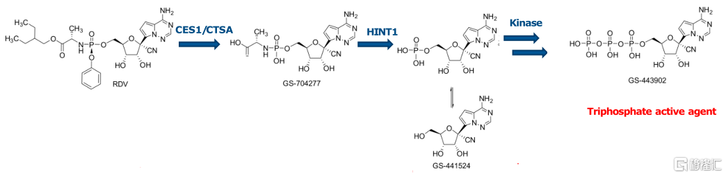 首先,我们先来看一下瑞德西韦它的作用机制。瑞德西韦是一种前药,在细胞内转化成活性的三磷酸形式,作为核苷酸类似物被RNA依赖性RNA聚合酶(RdRp)作为底物使用,插入到正在延长的RNA链中,阻断RdRp的复制。冷冻电镜结构也显示,双链RNA模板占据RdRp的中心,而瑞德西韦共价插入引物链,终止引物链的延伸。