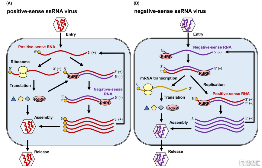 RNA依赖性RNA聚合酶(RdRp),也称RNA复制酶,是一种催化RNA从RNA模板复制的酶,可以辅助合成病毒RNA,以及切割RNA的核糖核酸内切酶,在病毒复制过程中起决定性作用。具体来说,它主要催化跟给定RNA模板互补的RNA链的合成。除呼肠孤病毒等病毒外,许多RNA病毒的基因组是单链RNA(ssRNA),分为正义和负义ssRNA病毒。无论哪种RNA基因组,RdRp是大多数含有RNA的病毒基因组中的必需蛋白质,包括新冠病毒SARS-CoV-2。