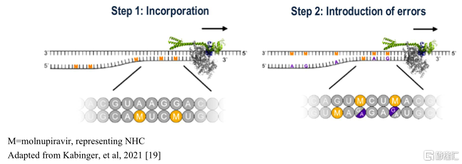 另一方面,虽然Molnupiravir与瑞德西韦都是前药,通过在细胞中转化为三磷酸形式的核苷酸类似物起作用,但是Molnupiravir在机理上并不是插入正在复制的RNA直接阻断RNA延伸,而是在病毒的遗传密码中作为错误碱基插入,随着突变的积累引起翻译提前终止才能最终阻断病毒的复制。也因为这个机制,Molnupiravir被认为具有潜在遗传毒性风险,其体外致突变性检测(Ames)实验结果呈阳性。另外Molnupiravir通过诱发“致命突变”的机制抑制病毒复制,理论上具有增加病毒突变的可能性,从而降低疫苗和药物的有效性,在临床研究中发现与安慰剂相比,接受Molnupiravir治疗的受试者体内的病毒更容易被检测到序列突变。
