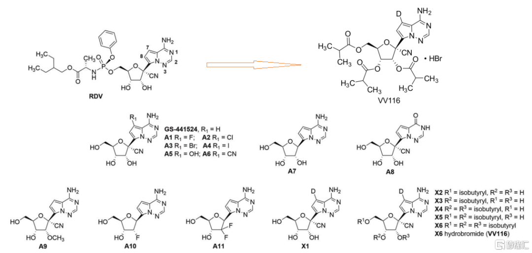 从结构上看,VV116也是瑞德西韦的衍生物。根据Cell Research发表的VV116的发现历程,研究人员验证了瑞德西韦(RDV)及其母体核苷(GS-441524)对SARS-CoV-2复制的抑制作用,并且确认了GS-441524比RDV更强的病毒复制抑制。因此,研究人员在GS-441524不同位点引进修饰性基团(卤素、羟基或氰基)对其进行改造,以提高对SARS-CoV-2的成药性,特别是口服给药性的可能性。