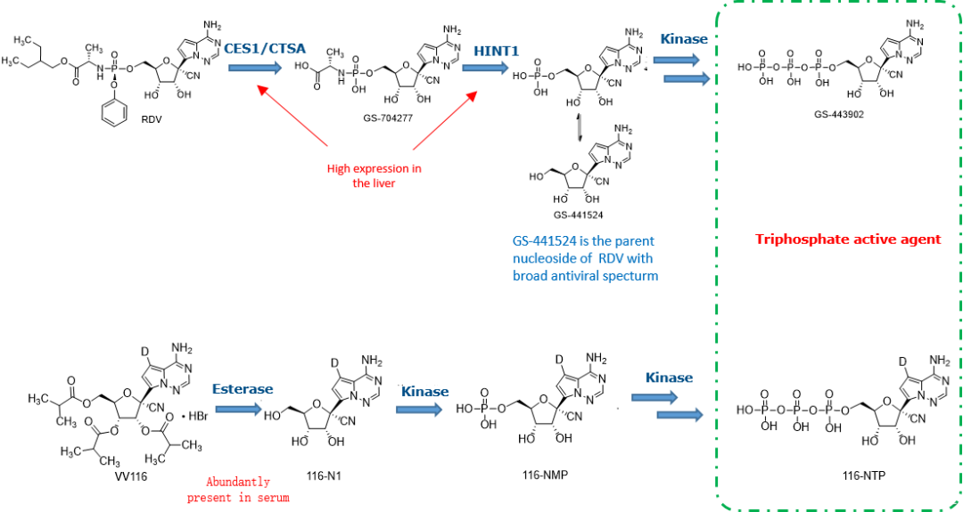 从作用机制上讲,VV116与瑞德西韦相似,都是前药设计,其口服吸收后迅速代谢为母体核苷(VV116核苷116-N1),该核苷在体内组织能够广泛分布。116-N1随后转化为与瑞德西韦相似的氘代的三磷酸形式核苷酸类似物,插入到正在延长的RNA链中,阻断RdRp的复制。目前,Ames试验和微核试验也证实VV116无致突变作用。