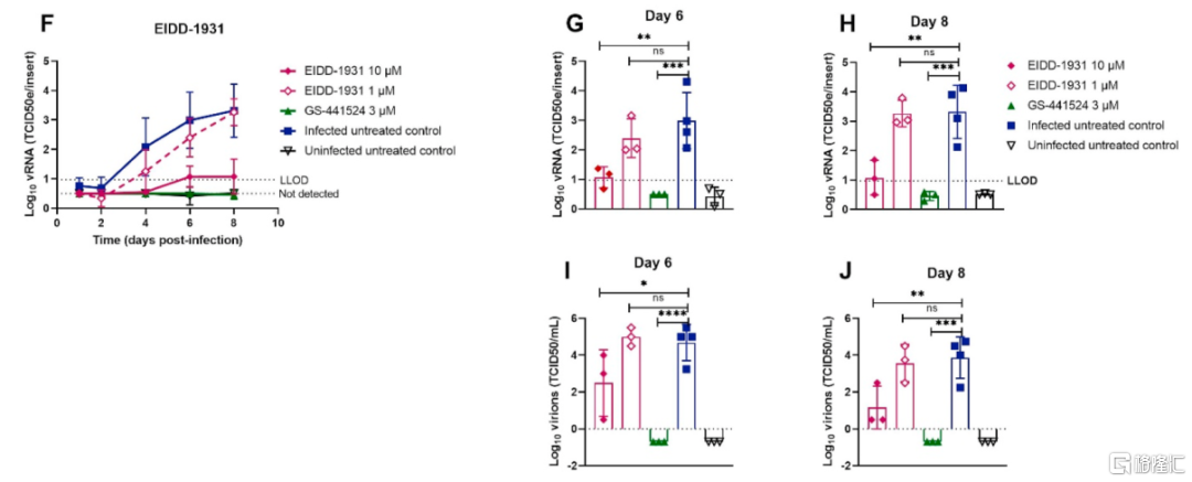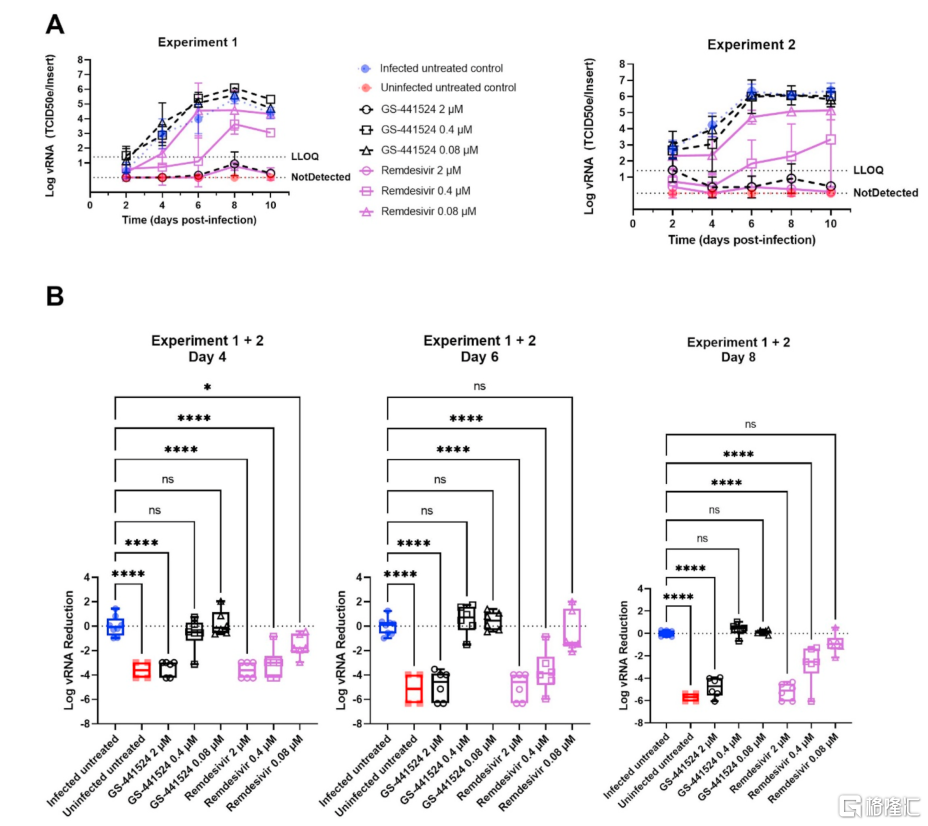 VV116的临床有效性在临床前数据中有所反映。文献数据显示,瑞德西韦和GS-441524(瑞德西韦的母体核苷)在2μM时具有相似且强大的SARS-CoV-2抗病毒效力,能够将复制抑制在定量限以下(LLOQ:虚线代表检测下限)。10μM时,GS-441524能够清除GHB-03021病毒的HtAEC培养物,治疗停止5天后没有观察到反弹。