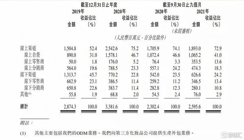 线上渠道的战略布局,使得上美集团迎来新的发展时代。2020年2月左右,线下销量下滑95%,但是线上渠道增长了107%。招股书显示,2019年、2020年及截至2021年9月30日止九个月,上美集团的线上销售额分别为15.05亿元、25.43亿元、18.93亿元,分别约占公司同期总收益的52.4%、75.2%及72.9%。