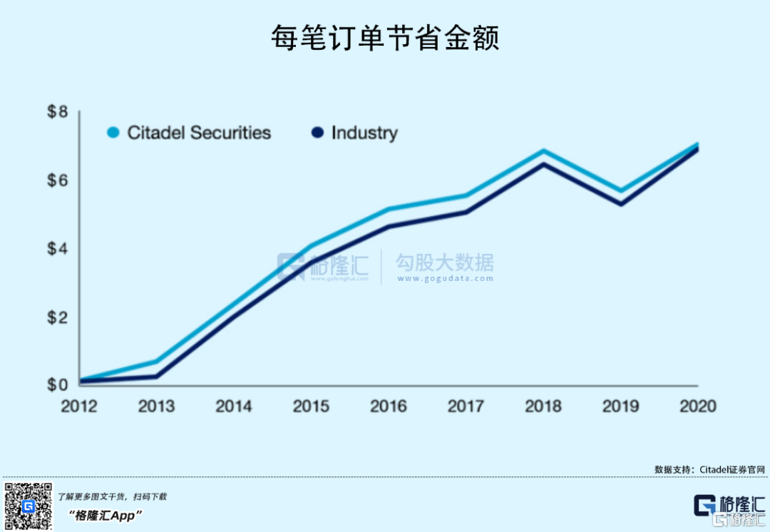 从每笔订单节省的金额来看,Citadel证券的优势领先市场。Citadel证券成立于2002年,业务涵盖一系列固定收益和股权产品,旨在降低交易成本,利用其过硬的技术背景,仅用时18个月就已经实现领先。