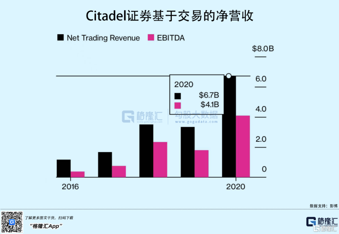 2017年初,赵鹏正式担任Citadel证券CEO,带领公司一路扩张,伴随近些年来散户对做市商越发依赖,Citadel证券的业绩高歌猛进,基于交易的净营收额由2016年12亿美元飙升至2020年的67亿美元,4年翻了5倍多。