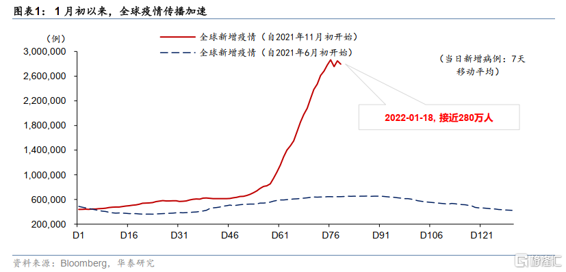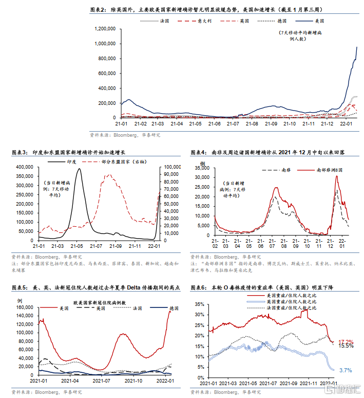 1月初以来,大多数欧美国家新增确诊继续加速、而英国和南非放缓。住院人数上升较快、但轻症居多,美国和英国的重症/住院人数之比较去年夏季Delta期间明显下降。截至1月19日,全球每日总新增确诊(MA7)较1月初增长116%,美国(173%)、法国(106%)、德国(152%)、意大利(121%)、日本(接近50倍)增幅较大。本轮疫情发展“滞后”于欧美国家的新兴市场,近两周疫情形势也趋于严峻。但南非和英国新增确诊先后见顶,英国重症、死亡率未见走高,一定程度上缓和了市场恐慌情绪。