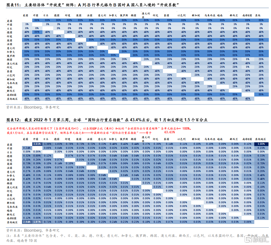 截至1月第三周,英国(从1月下旬开始)、美国(1月初开始)、加拿大(1月下旬开始)重新开始执行(类似)去年11月份、O株疫情爆发前的入境政策,即完全接种疫苗者入境无需隔离、只需要更短时间内的核酸检测。我们测算,截至2022年1月第三周,当前全球人员跨境流动“重启指数”在43.4%左右。相对1月初,重启指数回升约1.5个百分点(指数设定参见20220106《量化O株对全球重启的影响及其演变》,我们的华泰宏观“国际出行重启指数”可直观地监测全球各国防疫政策变化对跨国人员往来顺畅程度的影响,数值越低,则疫情对经贸往来的冲击越大。我们以近30个较大规模/受疫情影响较显著的经济体为“样本”列出矩阵,并将它们对其他国家的入境措施的松紧程度赋以数值、并以各国GDP占比做加权平均,最终合成“重启指数”)。