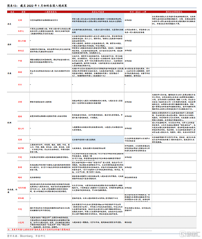 美国、英国、加拿大入境政策重新边际松动,其他欧洲国家暂维持较严格的隔离措施。截至1月第三周,日本仍全面封锁外国人入境;以色列开始允许“中风险地区”的国民入境;包括法国、德国、意大利在内的多数欧洲国家,以及韩国、印尼、泰国、新加坡、马来西亚、印度等亚太国家的入境管控措施仍较为严格,多数国家“要求完成疫苗接种、且入境后仍需接受一段时间(自我或集中)隔离”。而英国(从1月下旬开始)、美国(1月初开始)、加拿大(1月下旬开始)重新开始执行(类似)去年11月份、O株疫情爆发前的入境政策,即完全接种疫苗者入境无需隔离、只需要更短时间内的核酸检测。