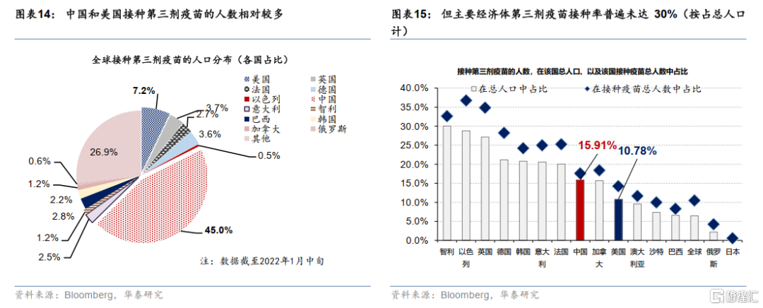 按2021年2~3季度各国分别的疫苗(日均)接种速率中位数计,假设从现在开始的疫苗接种数全部“投入”三针接种(考虑婴幼儿等部分群体不参与疫苗接种,目前至少接种一剂疫苗的人群已基本代表了各国的接种主体,未来完善三针接种也主要“瞄准”这部分人群),我们中性预计,美国(3.1个月)、英国(2.7个月)、法国(2.5个月)、德国(2.9个月)、意大利(2.7个月)、日本(3个月)、中国(2.4个月)、韩国(2.1个月)、澳大利亚(2.3个月)、加拿大(2.7个月)大多可以在未来2~3个月内(从1月第二周起算)达到70%以上的三针疫苗覆盖率。