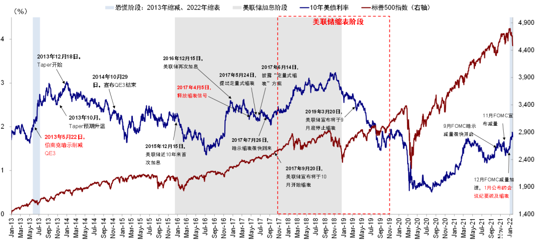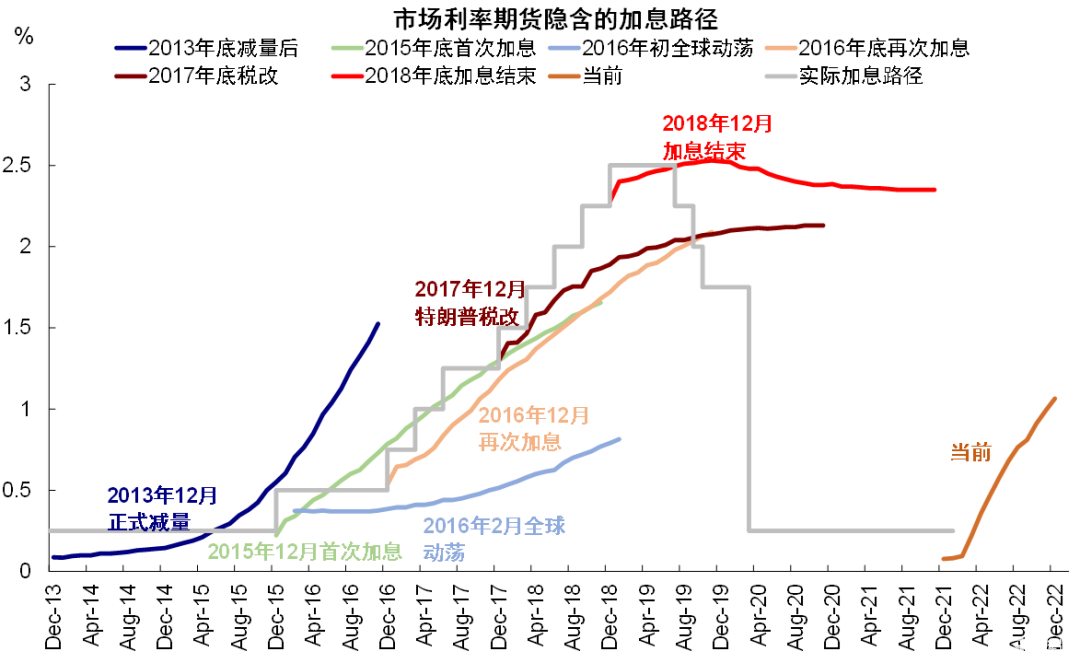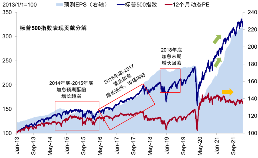 近期市场的波动很容易让人联想起2015年底首次加息后在2016年初引发的全球动荡、2018年2月因利率抬升的波动、甚至2018年10月的大跌。这三轮标普500指数最大回撤幅度分别为10.5%,10.2%和20%,本轮标普500的最大回撤幅度也达到10%。对比后可以看出,初始诱发因素都与紧缩预期及利率抬升等有关,也的确造成了明显回撤,但是市场在波动之后的中期走势却与更多受所处的宏观环境和基本面影响。例如2016年初动荡后,市场再度进入长达2年的牛市,尽管期间加息缩表持续推进。2018年2月在税改推动的盈利增长下市场也再度修复并创新高,直到2018年底盈利彻底见顶后才面临更大压力。