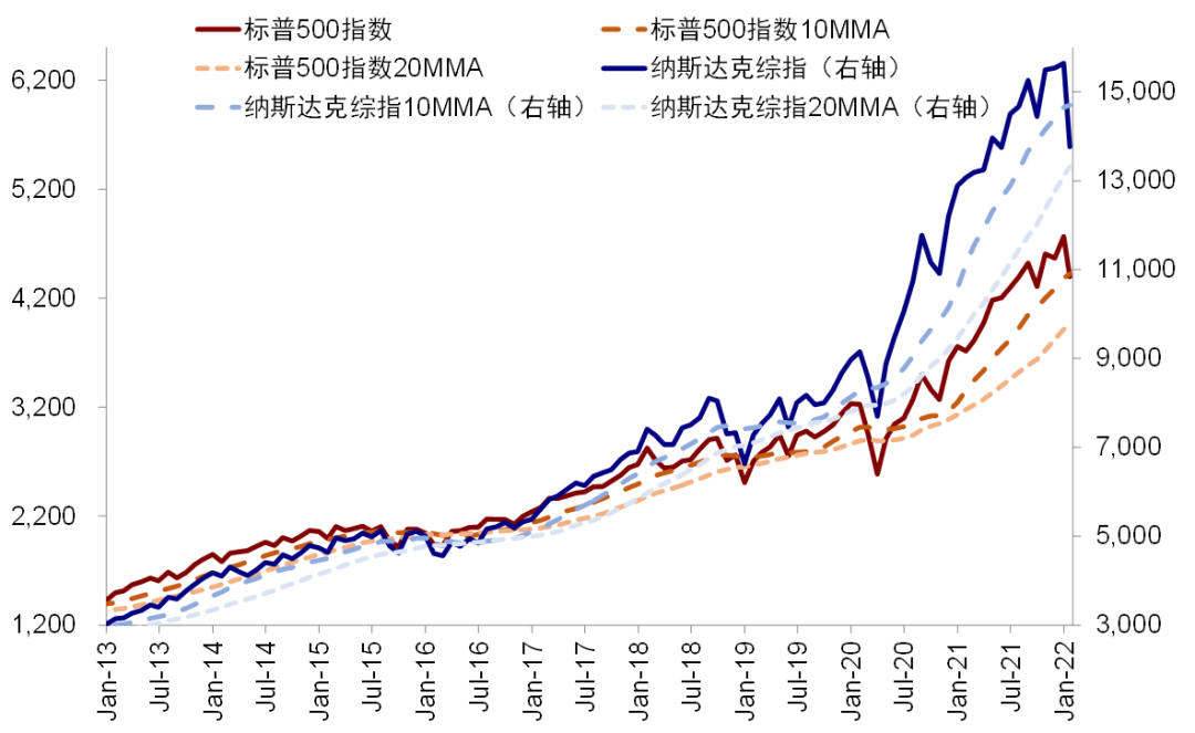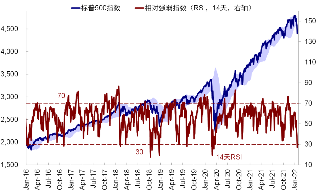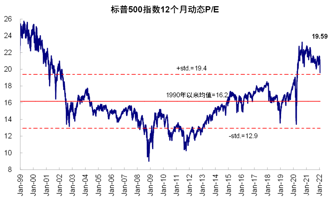 我们在昨天的报吿《美股跌到位了么?计入了多少预期?》中分析了近期回调后美股估值和情绪等指标所处的位置,整体结论为:1)年初以来美股回调都是估值所致,盈利预期整体依然稳健。当前标普500 12月动态估值回落至19.6倍,接近长期历史均值上方一倍标准差(19.4倍),可比口径下已经低于疫情前。我们的模型测算基本处于合理水平,而一些技术指标如超卖已较极端,指数也处于关键支撑位上(如标普在4400附近、纳指为13300左右);信用利差并未大幅抬升,长端国债空头大幅减少等;2)根据模型测算,美股当前计入一年加息预期为3.3次,相比市场利率期货和主流机构的预期也算是基本充分;3)如果加息4次利率抬升100bp的话,我们测算对应估值收缩10%。2年期国债已经升至1.2%,此期间估值已回落8%,也有了一定的反应;4)美股在2015年底首次加息后的全球动荡、2018年2月因利率抬升的波动、2018年10月的大跌中最大回撤幅度分别为10.5%,10.2%和20%,隔夜美股盘中跌幅也已经达到10%左右。