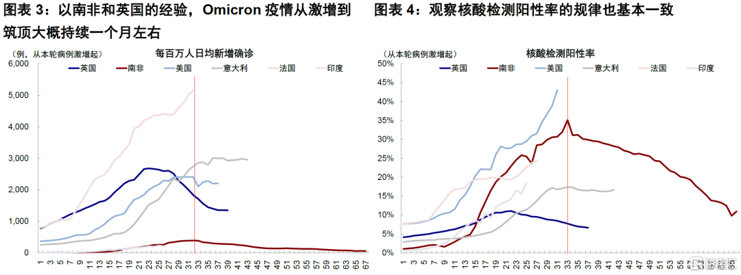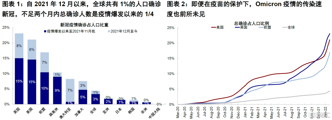 此轮Omicron疫情已经造成了大量感染,欧美发达国家拐点将至。自2021年12月以来,全球共有1%的人口确诊新冠,短短两个月内的总确诊人数已经占到疫情爆发以来的1/4,可见Omicron的传播速度,而在英国、美国、欧盟和澳大利亚,2021年12月至今增加的确诊病例占人口比已经超过5%。即便在疫苗的保护下,Omicron疫情的传染速度也前所未见。不过正是由于此轮疫情冲高速度很快,加上以轻症为主,因此冲高后回落的持续时间比前几轮也相对更短。