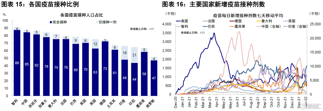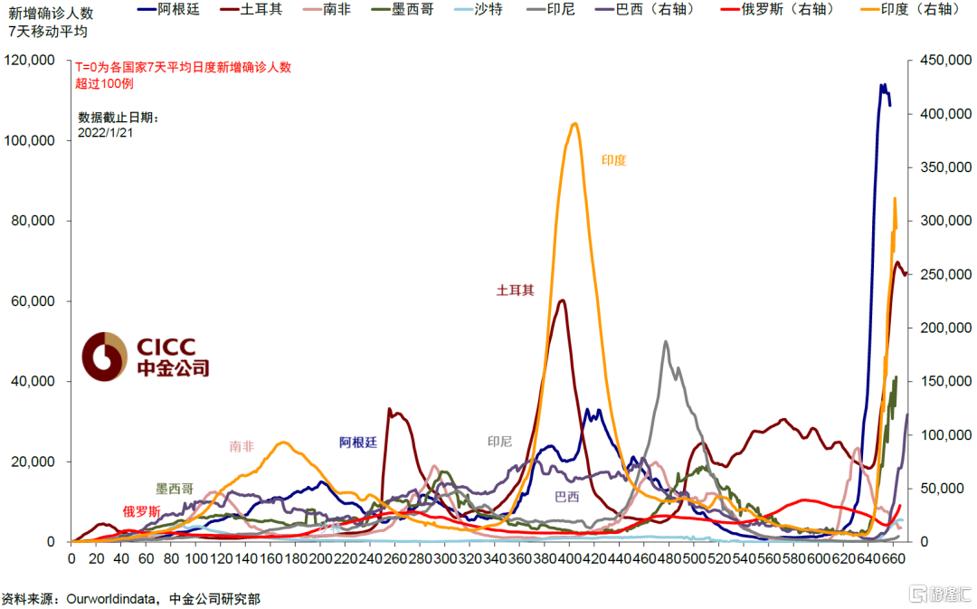 新兴市场中部分国家疫情同样筑顶,如此前升级较早的阿根廷和土耳其等,但由于大多新兴市场本轮疫情传播时间滞后于欧美发达国家,以及疫苗接种比例相对更低,大多国家可能在2月筑顶。