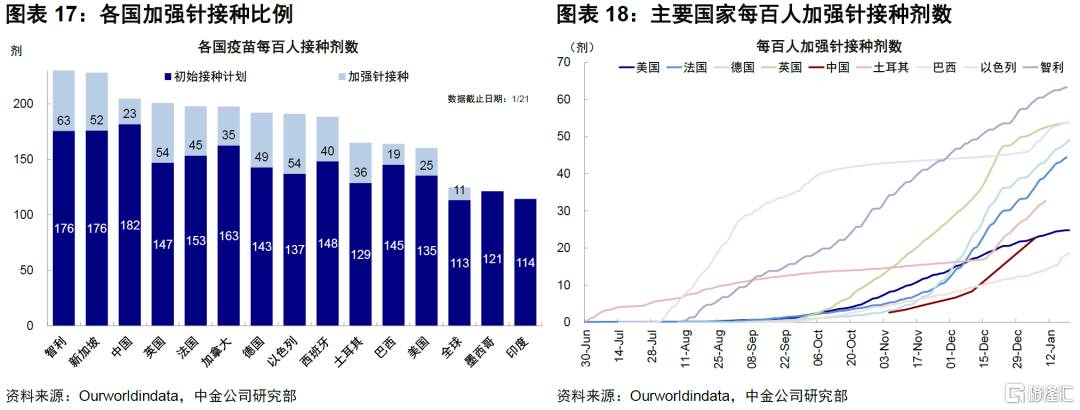虽然由于疫苗接种的不均衡,本轮疫情在低接种地区仍将持续一段时间,但由于疫情拐点将至,对经济扰动的降低是基准情形。虽然全球免疫基数上升,但不均衡情况仍存在,尤其是低收入国家较多的非洲免疫人口占比不足20%,这也导致疫情可能仍是长尾退出的模式,也不排除孕育新变种的风险。但除非发生能够完全逃脱现有免疫和治疗手段的恶性突变,免疫基数+治疗能力仍是主导疫情退出的关键变量,因此经济扰动的逐渐降低仍是基准情形。在这个背景下,全球边境开放进展更多取决于这两个变量的组合,加强针接种比例和药物进展是增加医疗系统应对能力的关键,也是各国政策决策的重要标准。